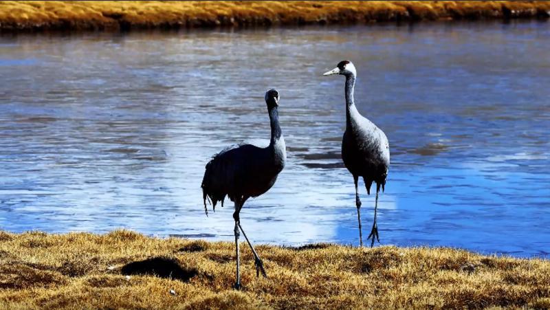 正午時分,晴空高照,廣袤的金色草甸在陽光下熠熠生輝,星羅棋布的藍(lán)色湖泊如寶石般點綴其間。成群的黑頸鶴悠然活動,或低頭覓食,或緩步行走,或展翅輕舞,其優(yōu)雅身姿與藍(lán)天、碧水、草甸交相輝映,構(gòu)成一幅寧靜而生機盎然的高原畫卷。